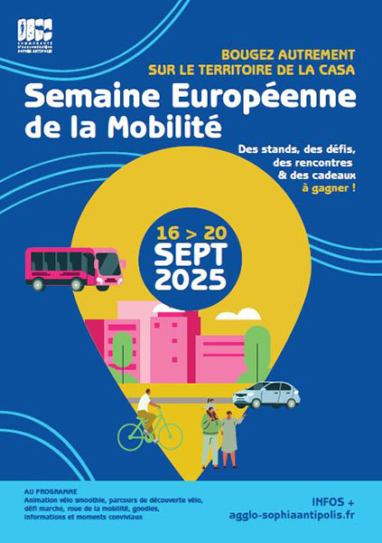 À l’occasion de la Semaine Européenne de la Mobilité, la Communauté d’Agglomération Sophia Antipolis vous invite à bouger autrement du 15 au 19 septembre 2025. Pendant cinq jours, des animations, des stands, des défis et des moments conviviaux vous attendent autour des mobilités durables : bus, covoiturage, vélo, marche et multimodalité.