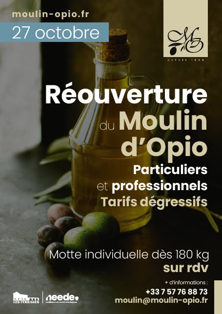 Aujourd’hui, le moulin d’Opio rouvre ses portes pour la presse des olives et vous propose de nombreux évènements.