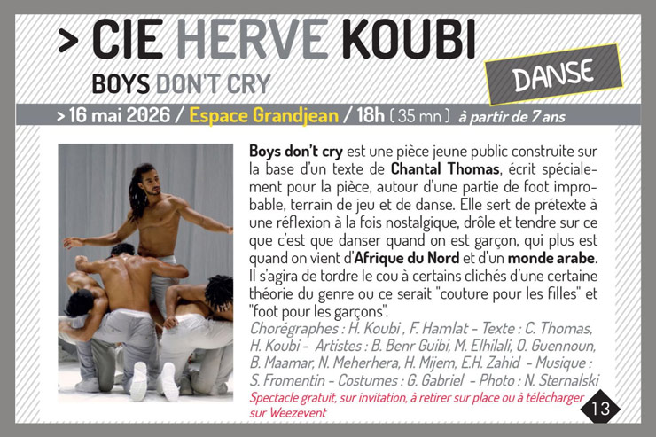 Boys don’t cry est une pièce jeune public mêlant foot et danse, où Chantal Thomas explore avec tendresse et humour les stéréotypes de genre, à travers l’histoire de garçons, issus d’un monde arabe, qui redéfinissent les codes de la masculinité.