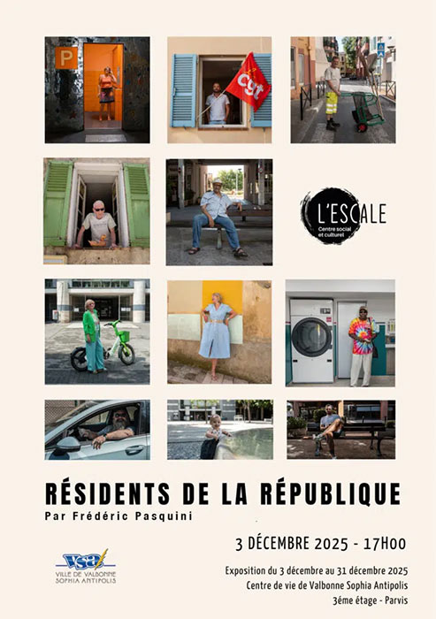 L’Escale présente l’exposition du 3 au 31 décembre « Résidents de la République » de Frédéric Pasquini qui met à l’honneur les habitants de Valbonne Sophia Antipolis. Elle est à découvrir au deuxième étage du Centre de Vie, sur le parvis.