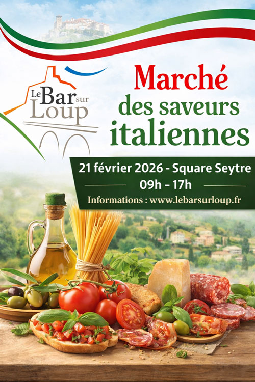 Le21févr.de09h00 à 17h00LieuSquare SeytreLe Bar-sur-loupMARCHÉMarché des saveurs italiennesAjouter à mon calendrierSamedi 21 février 2026, de 9h00 à 17h00 sur le square Seytre, marché des saveurs italiennes.Sélection de la vue© OpenStreetMap contributorsFermerPrécédentRetour à la listeSuivant