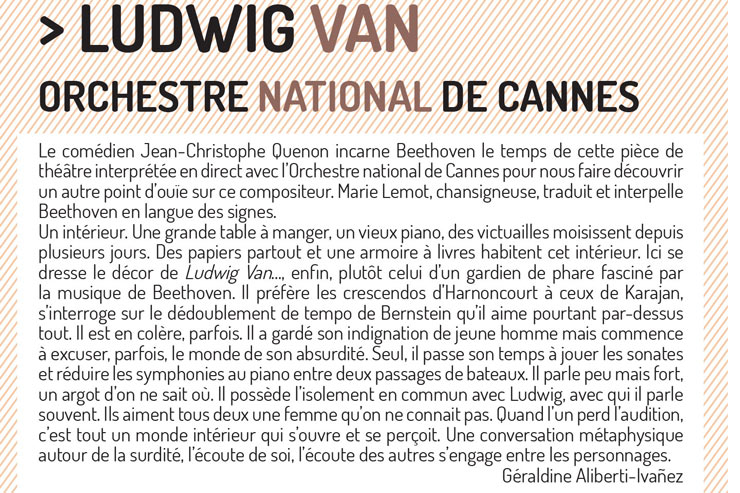 Ludwig Van... met en scène un gardien de phare fasciné par Beethoven, incarné par Jean-Christophe Quenon, avec l’Orchestre national de Cannes et la chansigneuse Marie Lemot, dans une réflexion poétique sur la surdité et l’écoute.