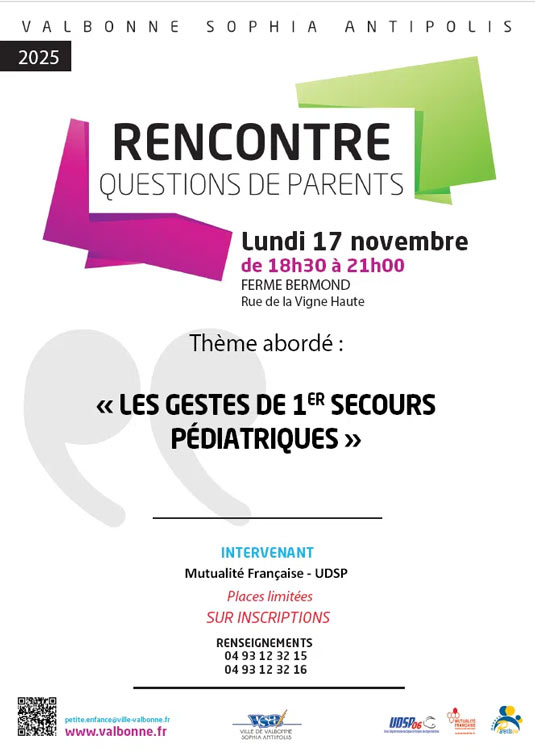 Ajouter à mon calendrierConférence sur les gestes de premiers secours pédiatriques avec la Mutualité française lundi 17 novembre de 18h30 à 21h à la Ferme Bermond. Entrée libre.