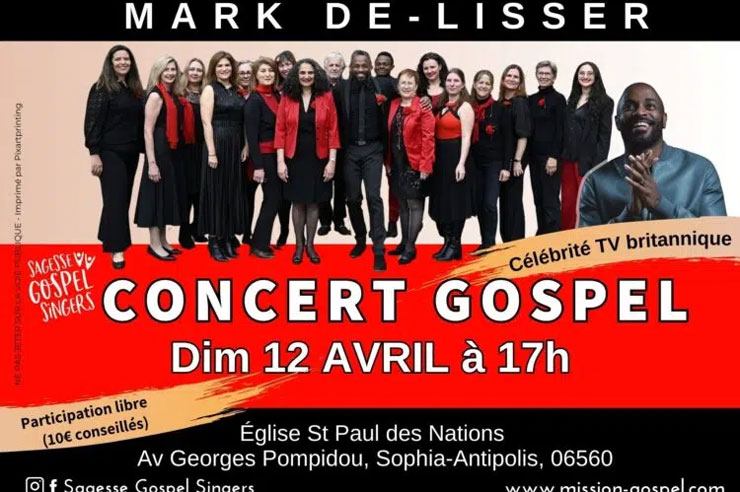 Concert Sagesse Gospel Singers avec Mark De-Lisser en invité le dimanche 12 avril 2026 à 17h à l’église Saint Paul des Nations. Entrée sans billet ni réservation.