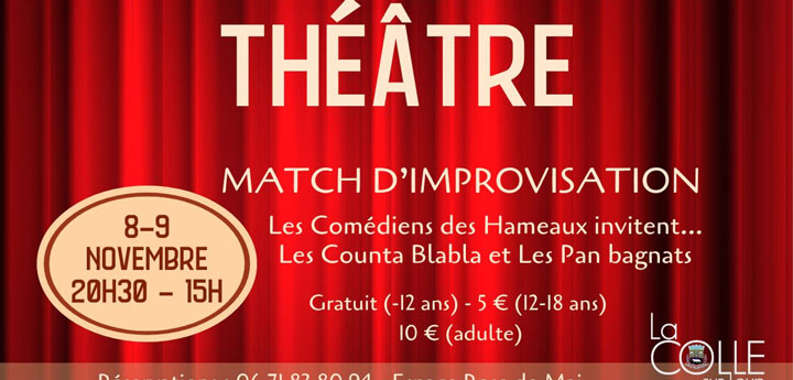 Les Comédiens des Hameaux présentent leur Match d’impro à l’Espace Rose de Mai et invitent 2 ligues d’improvisation : Les Counta Blabla et Les Pan Bagnat.
