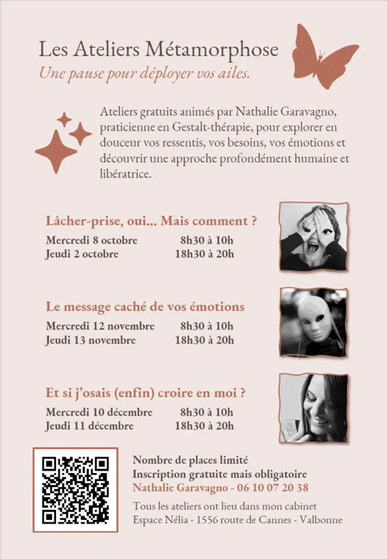 Ateliers gratuits animés par Nathalie Garavagno, praticienne en Gestalt-thérapie, pour explorer en douceur vos ressentis, vos besoins, vos émotions et découvrir une approche profondément humaine et libératrice.
