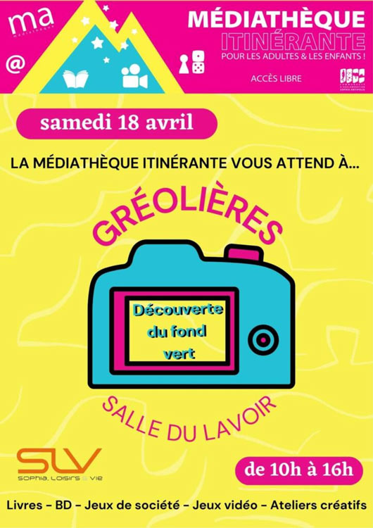Le18avrilde10h00 à 16h00LieuSalle du lavoir - GréolièresGréolièresCULTURE, LOISIRSMédiathèque itinéranteAjouter à mon calendrierLivres - BD - Jeux de société - Jeux vidéo - Ateliers créatifsSélection de la vue© OpenStreetMap contributorsFermerPrécédentRetour à la listeSuivant