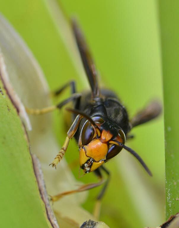 Le frelon asiatique est légèrement plus petit que le frelon européen. Il a un teint brun foncé et un abdomen terminé par un segment jaune orangé. Ses pattes sont jaunes.